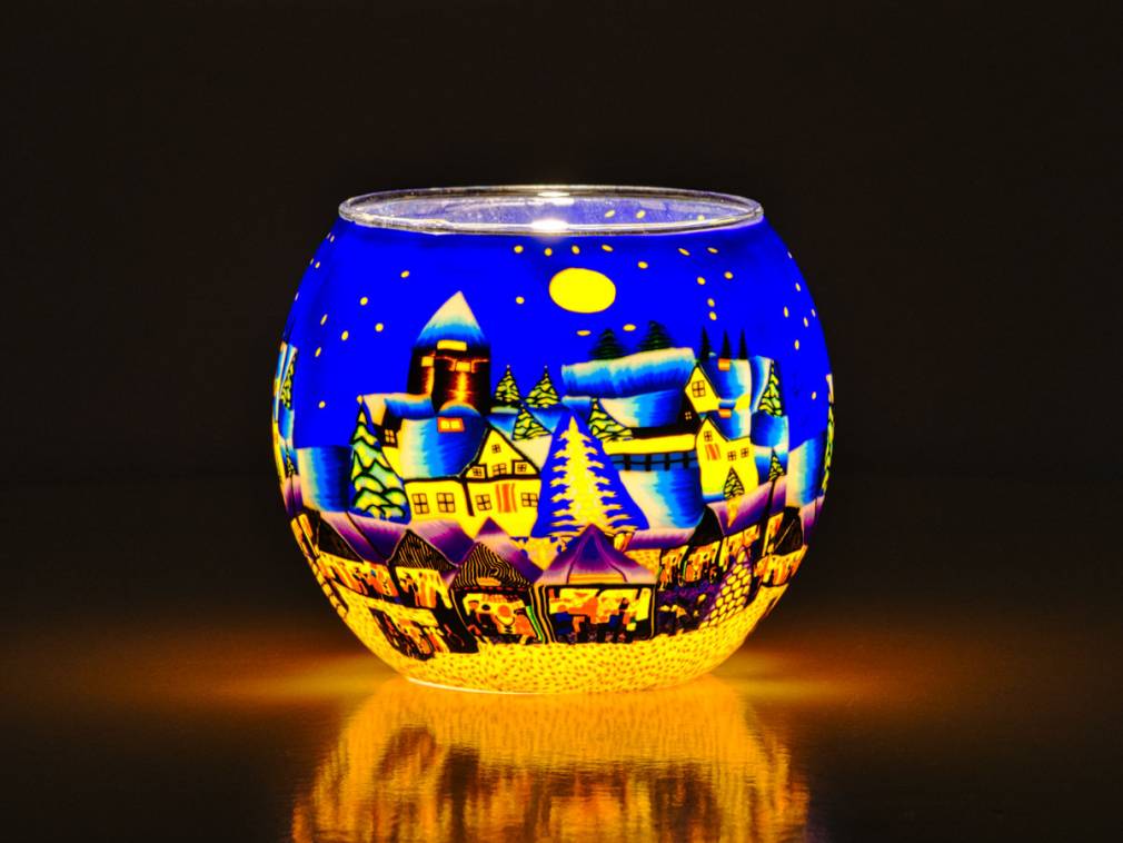 Bitte beachten Sie, dass die Leuchtgläser beim Fotografieren in Studioumgebung zur besseren Erkennung der Motive mit einer elektrischen Lampe beleuchtet wurden. Beim Beleuchten mit einem Teelicht, ist diese nicht ganz so hell, wirkt dafür lebendiger und verbreitet einen gemütliche Atmosphäre.