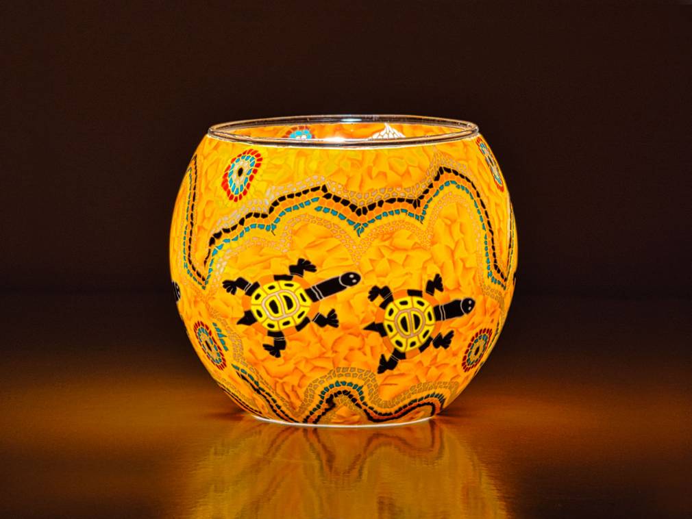 Bitte beachten Sie, dass die Leuchtgläser beim Fotografieren in Studioumgebung zur besseren Erkennung der Motive mit einer elektrischen Lampe beleuchtet wurden. Beim Beleuchten mit einem Teelicht, ist diese nicht ganz so hell, wirkt dafür lebendiger und verbreitet einen gemütliche Atmosphäre.