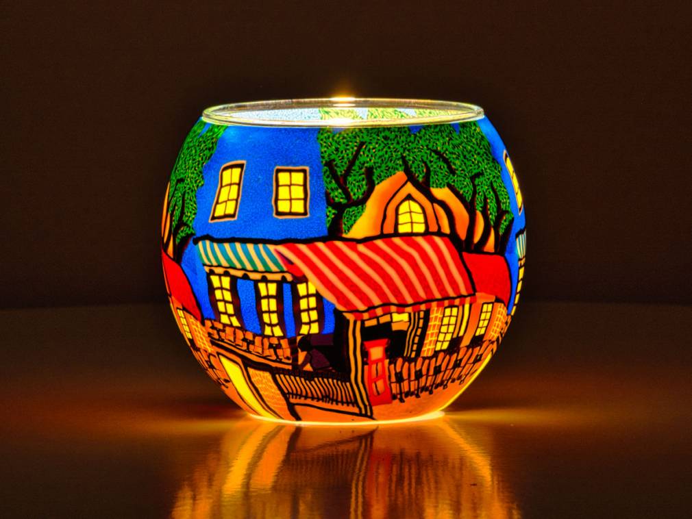 Bitte beachten Sie, dass die Leuchtgläser beim Fotografieren in Studioumgebung zur besseren Erkennung der Motive mit einer elektrischen Lampe beleuchtet wurden. Beim Beleuchten mit einem Teelicht, ist diese nicht ganz so hell, wirkt dafür lebendiger und verbreitet einen gemütliche Atmosphäre.
